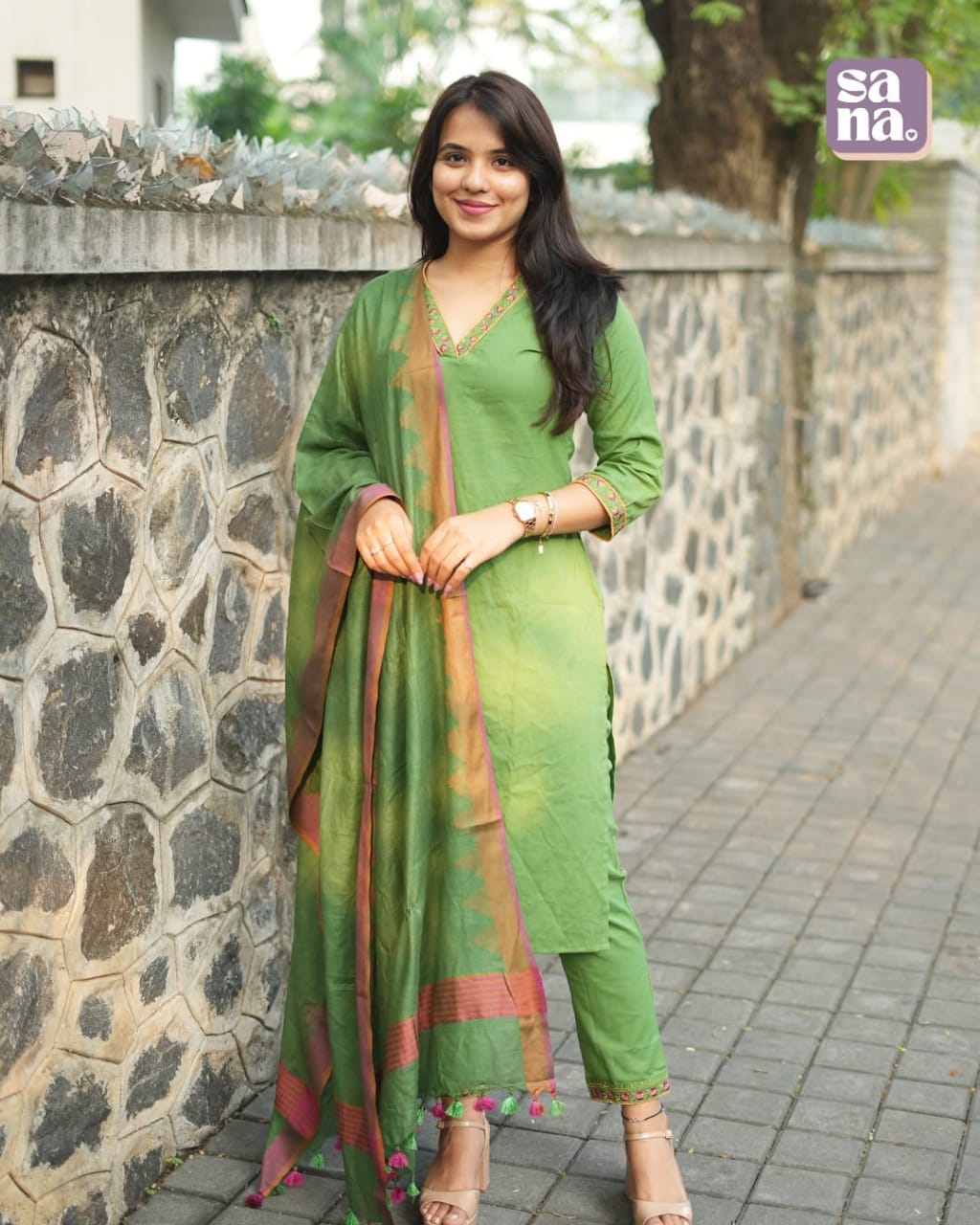 You will be so much in love with this south handloom outfit for combinations of temple border self thread handloom butti south cotton kurta and south cotton pant paired with south cotton duppata self thread self weaving temple border add a unique vibe.