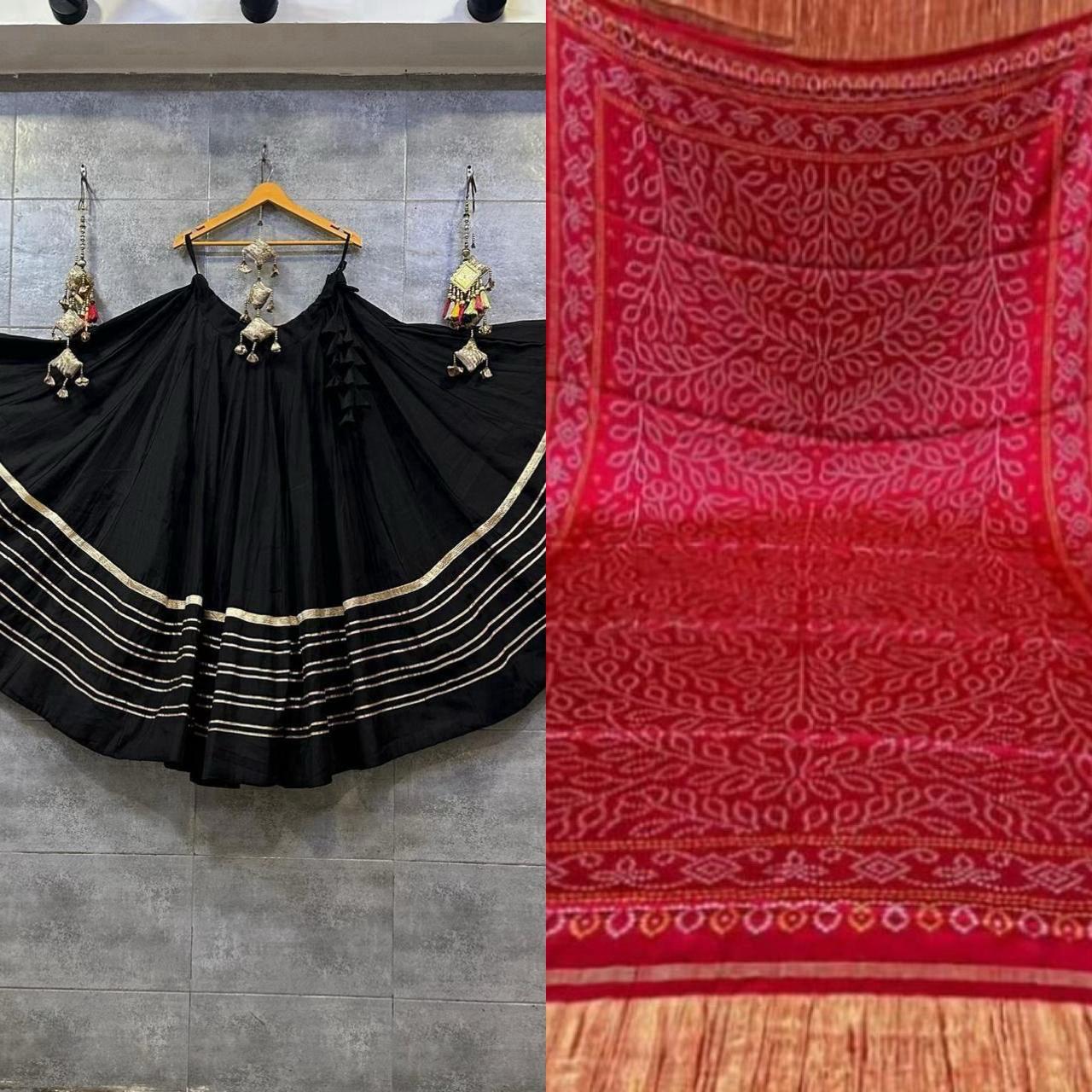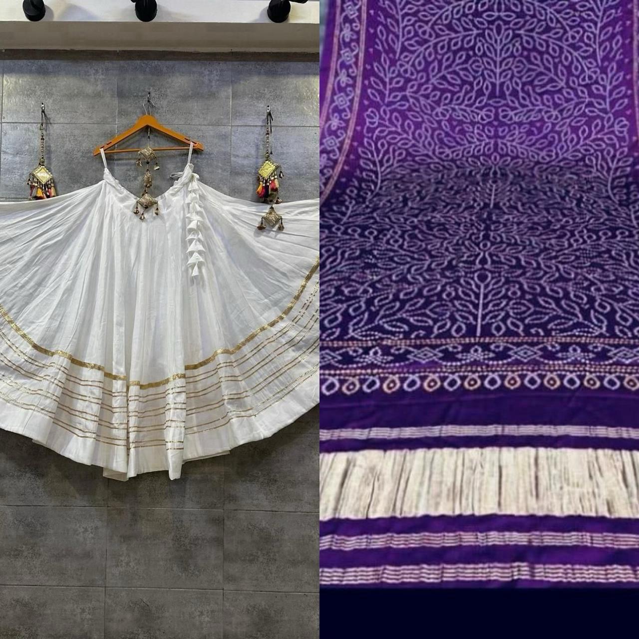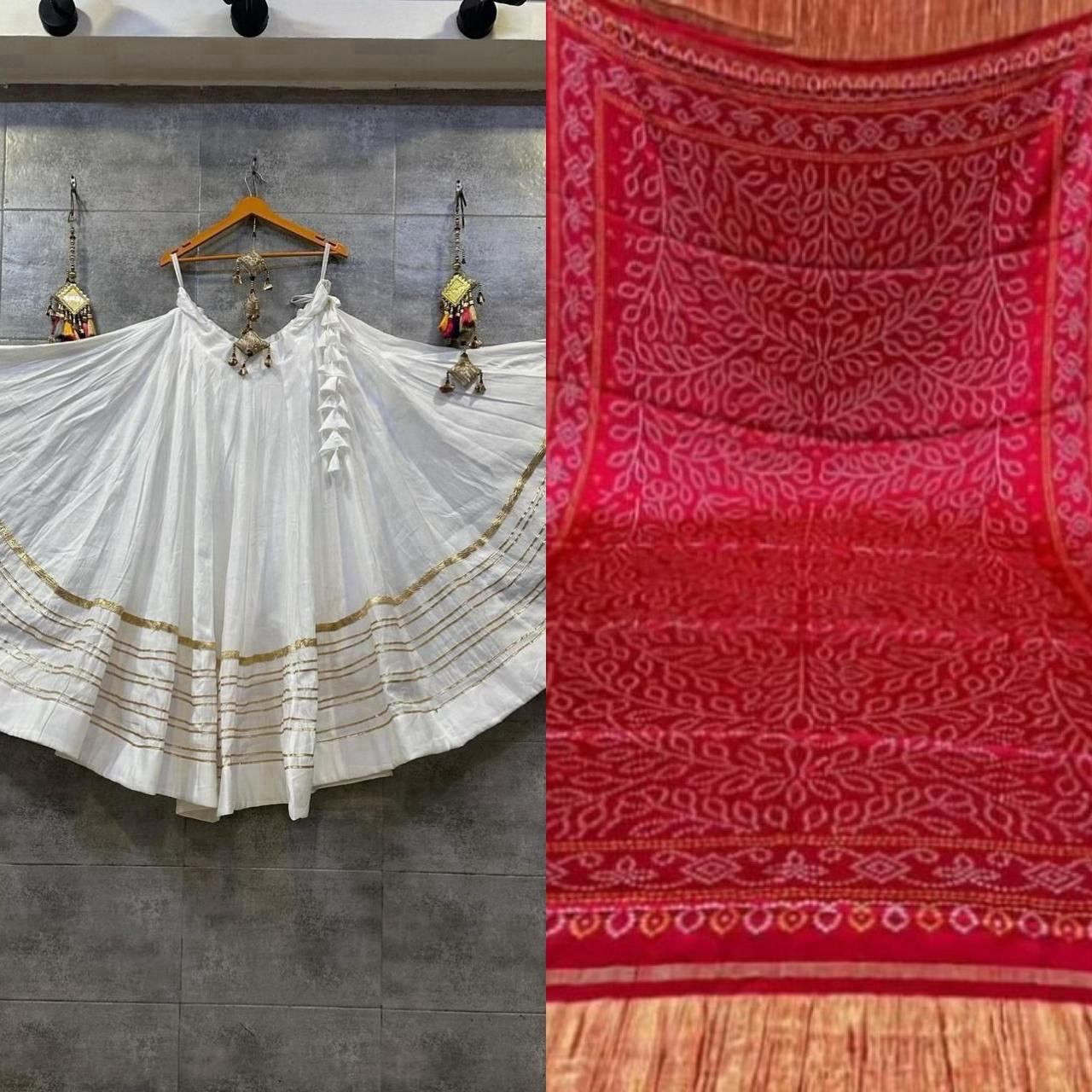 Lehenga Work : Dot and Ikkat Print With Original Mirror Gamthi Work Lace And Foil Work